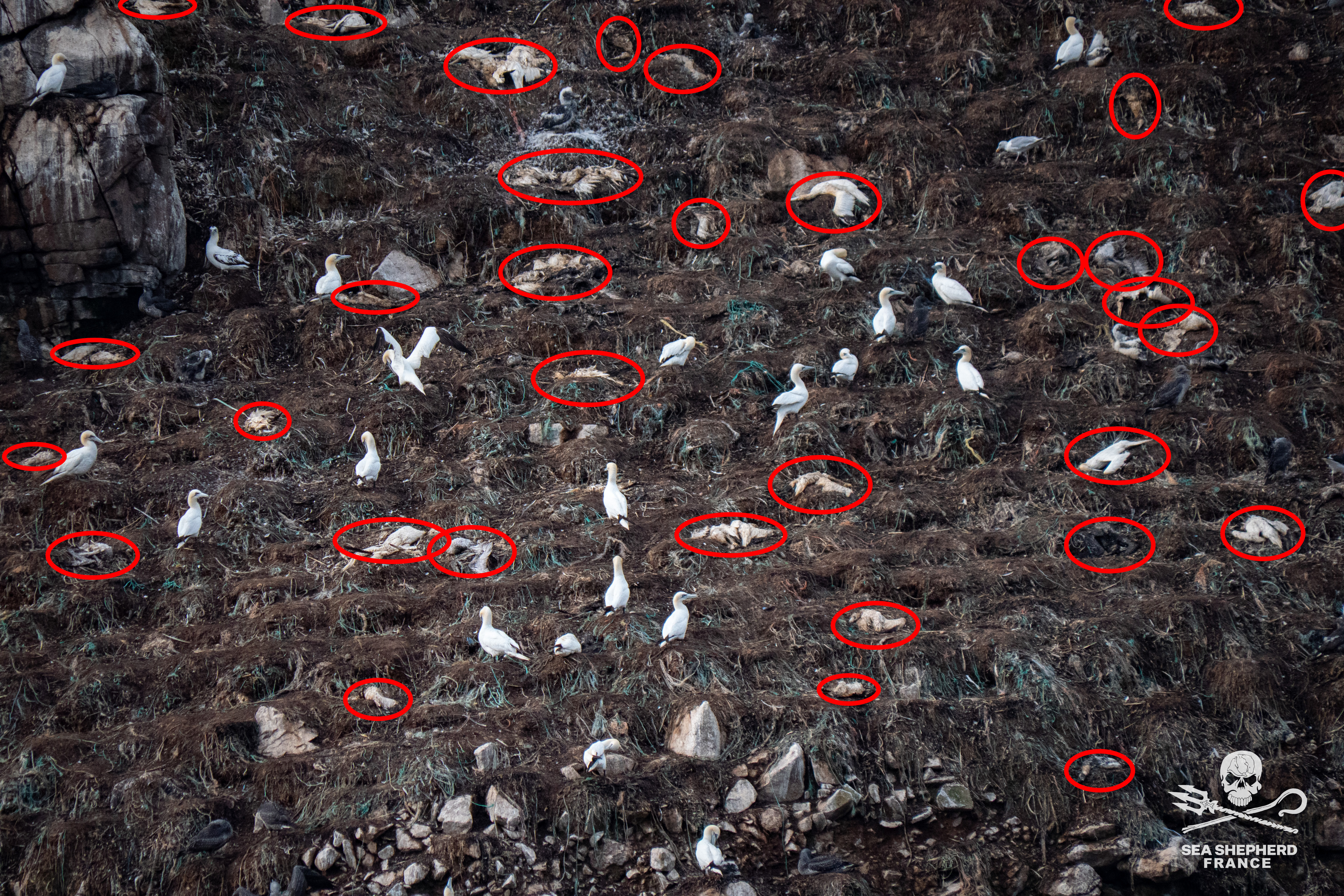 Below : Of the 150 nests in the image, only 34 are occupied by living gannets, 13 of which are juveniles. There are also 33 dead gannets (red circles).
