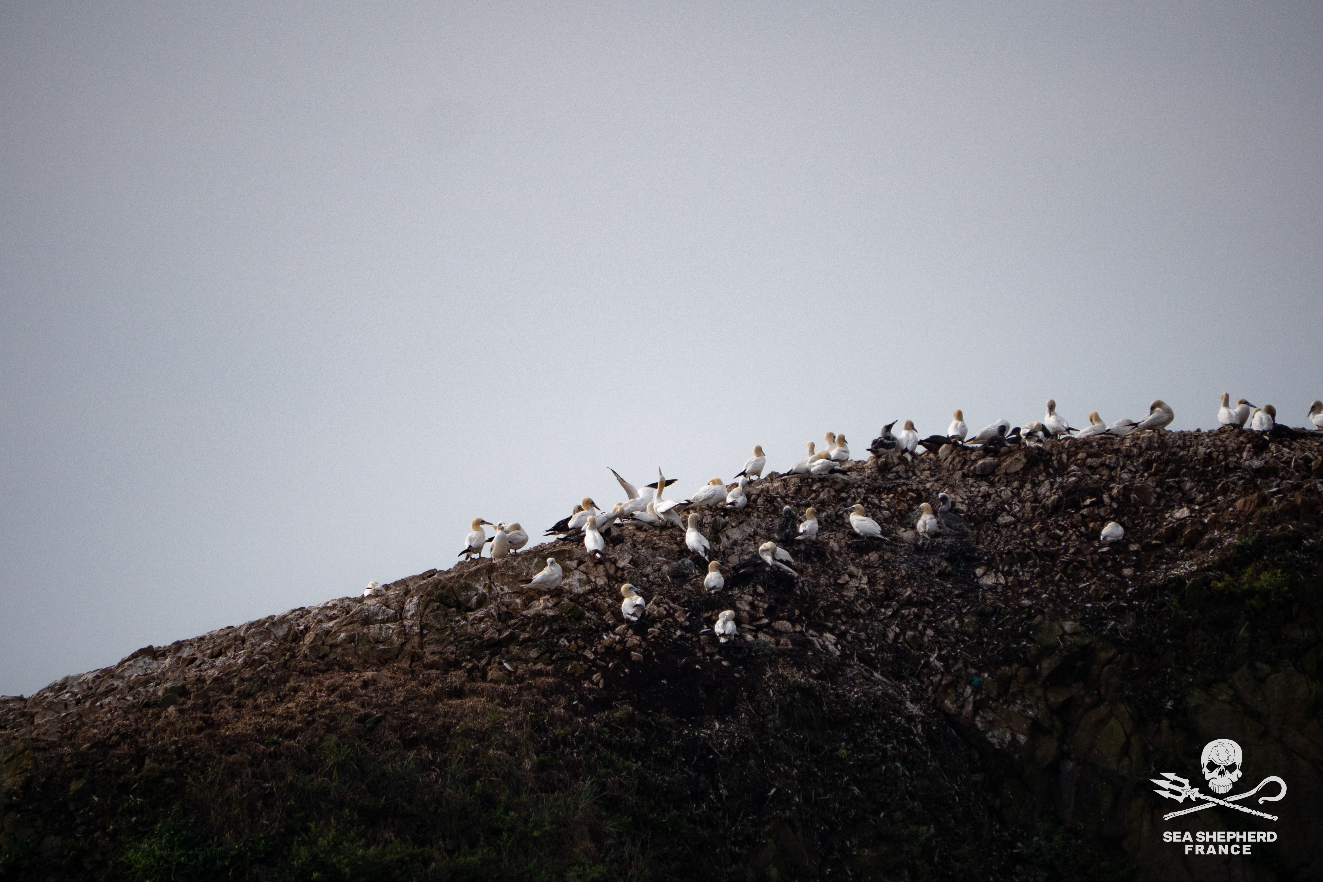 The Northern gannet usually builds the base of its nests with plant debris. Over the years it will become a pill of feathers, fish remains, carcasses of other birds and excrement. However, on Rouzic Island, the blue-green color of the nests alerts : they are pieces of fishing gear, which testifies to an important marine and coastal plastic pollution.